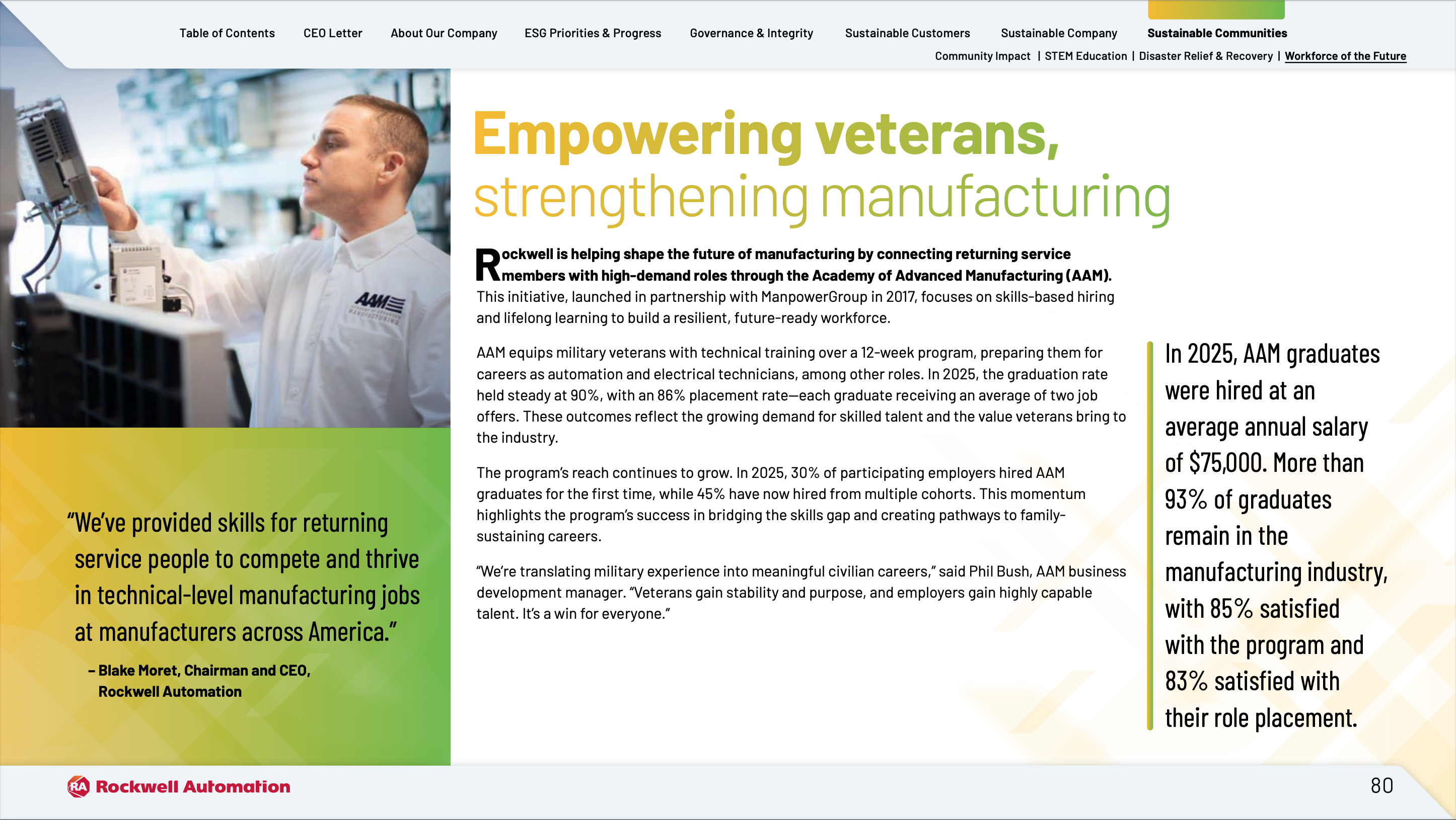 Manufacturing companies are facing a skill shortage and struggling to find candidates to fill many critical manufacturing jobs. In addition, the costs to source, recruit, assess, select and develop a highly skilled workforce are growing rapidly. To tackle the critical skills shortage in the fast-evolving manufacturing sector, Rockwell Automation and ManpowerGroup developed the Academy of Advanced Manufacturing (AAM) – a joint initiative to provide U.S. military veterans with the upskilling they need to succeed in advanced manufacturing roles. This veteran training program not only helps bridge the manufacturing skills gap, but it also helps provide jobs for veterans.