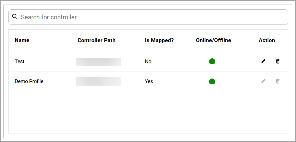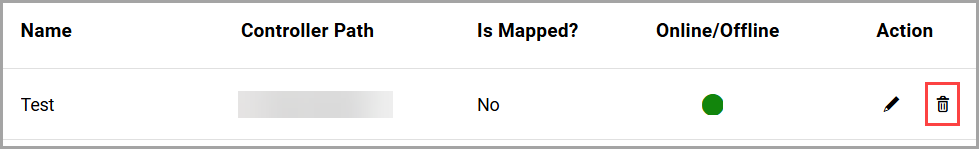 do the following steps:- Under theActioncolumn, click the delete icon next to the corresponding controller.Thesuccessfully deletedmessage is displayed.Delete Controller Profile