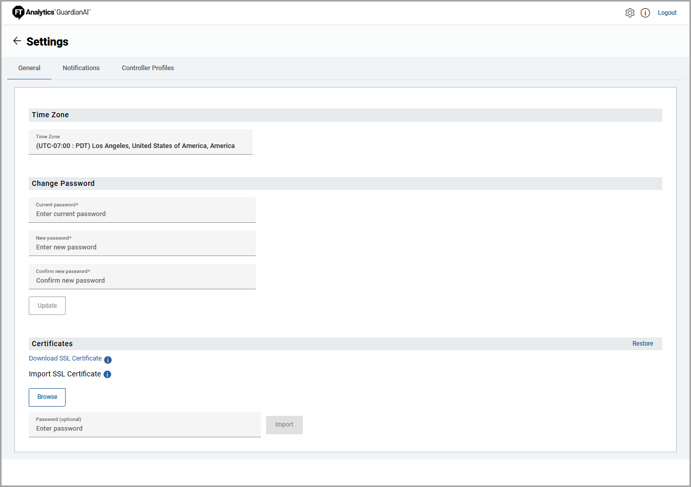 - Certificates: Certificates are used to establish the webpage identity for FactoryTalk Analytics GuardianAI. The application comes out of the box with a self-signed certificate. Users have the option to upload their certificates.