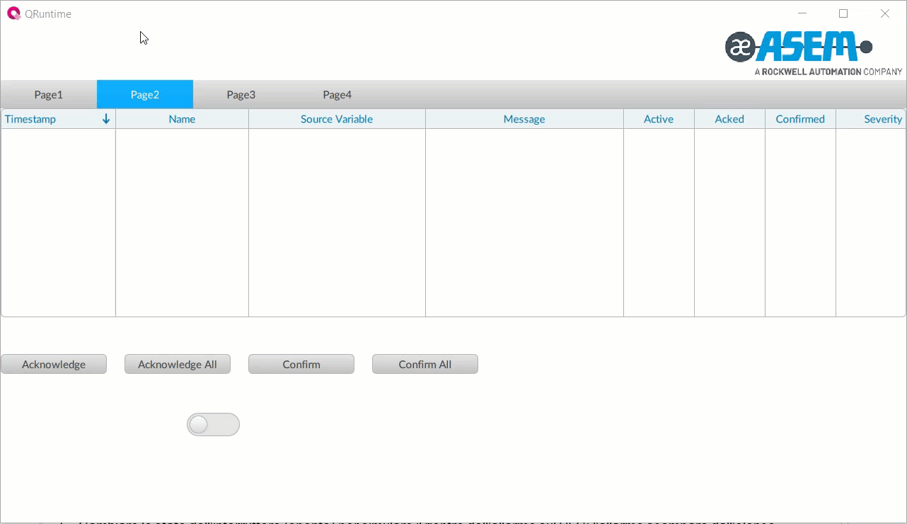 - SelectPage2. To simulate the alarm activation on the controller, change the switch status (on): the alarm grid displays the alarm data.