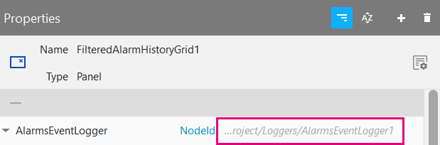 - DragAlarmsEventLogger1onto the value of theAlarmsEventLoggerproperty to display the data recorded by the logger.