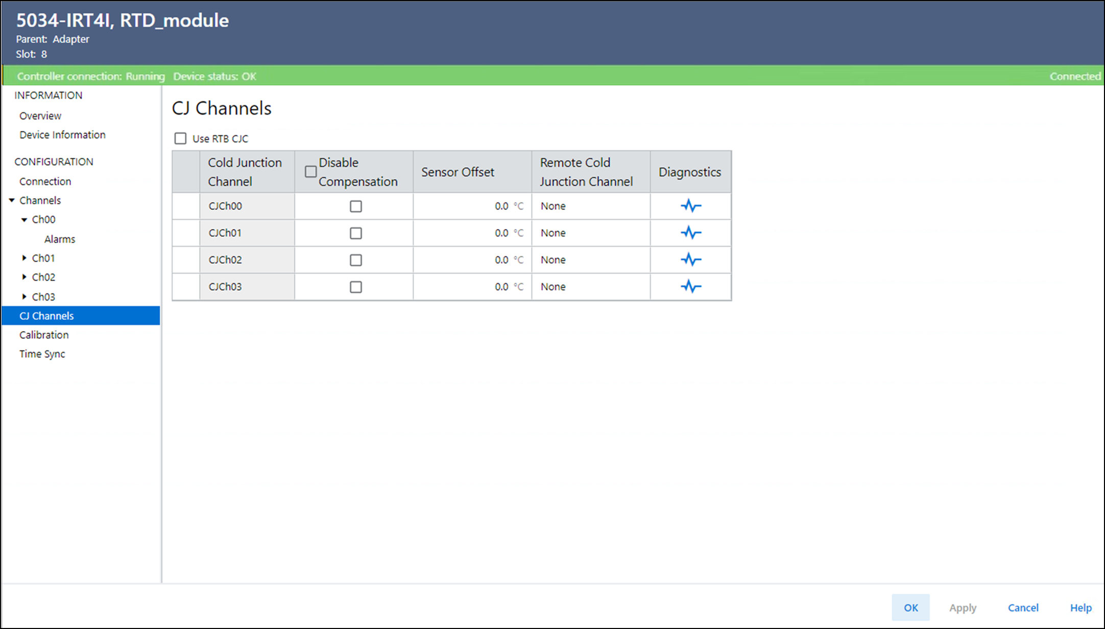 - RTB CJC - If None is selected in the Remote Cold Junction Channel column and an RTB with CJC is used, then you can assume that the channel is using the RTB CJC for CJ compensation.IMPORTANT: If using RTB CJC is a must for your application due to the accuracy requirement, make sure that Use RTB CJC checkbox is selected and you are using an RTB with CJC. If you are using standard RTB (without CJC) with Use RTB CJC checkbox selected, the channel gets faulted.