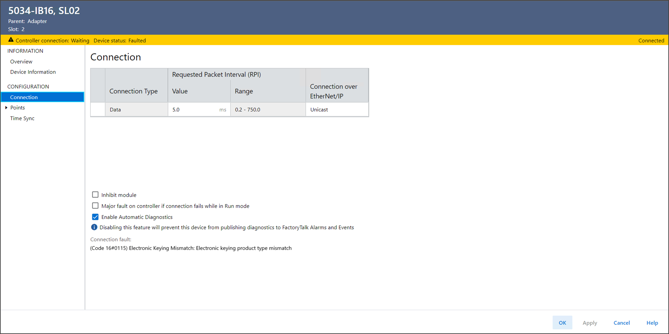 Si la conexión falla, vaya a la vista Connection y compruebe el código de error en el área Connection Fault.