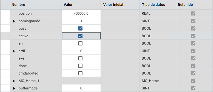 - El bloque de funciones MC_Home solo se puede cancelar mediante un bloque de función MC_Stop o MC_Power. Si se cancela antes de completarse, la posición inicial buscada anteriormente no se considera válida y se elimina el estado inicial del eje.
