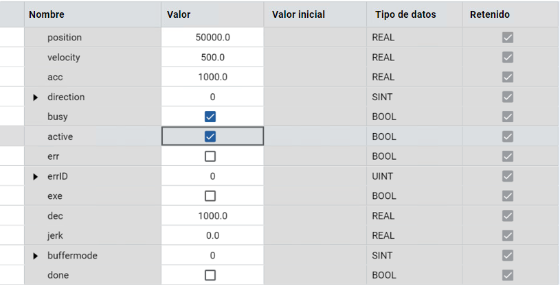 Active | Salida | BOOL | Si es Cierto, indica que el bloque de función tiene el control del eje. |