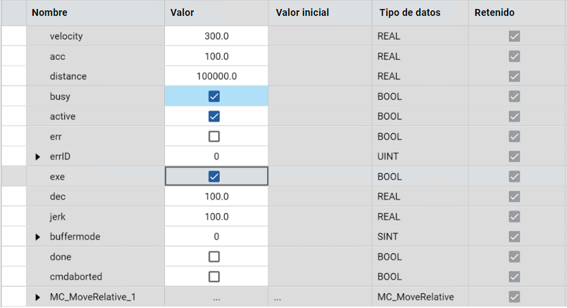 La instrucción MC_MoveRelative envía un movimiento controlado a una distancia especificada relativa a la posición actual en el momento de ejecución.
