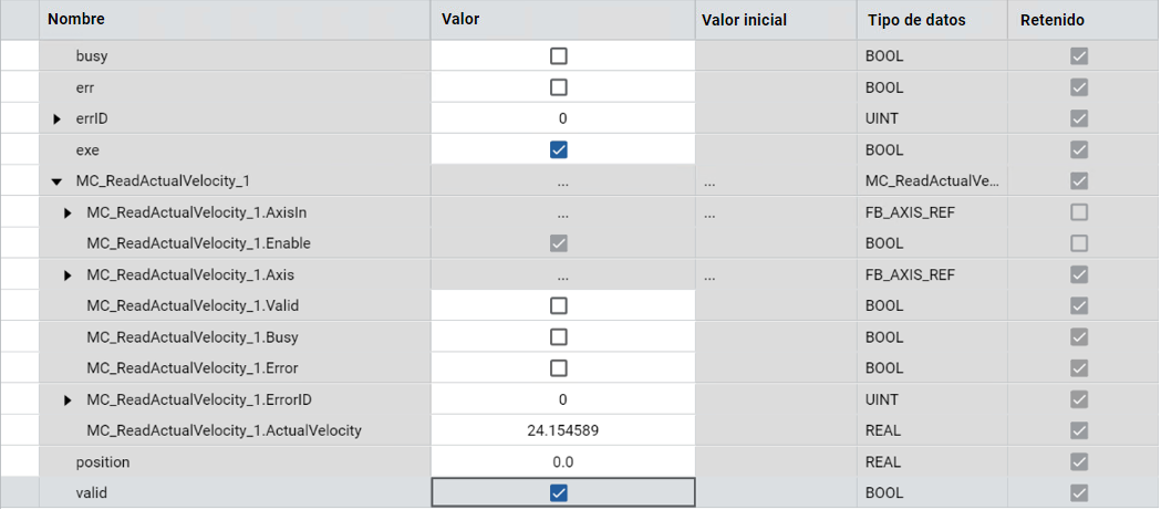 La instrucción MC_ReadActualPosition devuelve la posición real del eje de retroalimentación. MC_ReadActualPosition solo es aplicable a movimiento de retroalimentación.