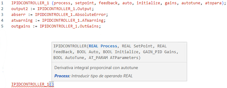 (* ST equivalence: IPIDController1 is an instance of IPIDController block *) IPIDController1(Proc, SP, FBK, Auto, Init, G_In, A_Tune, A_TunePar, Err ); Out_process := IPIDController1.Output ; A_Tune_Warn := IPIDController1.ATWarning ; Gain_Out := IPIDController1.OutGains ;