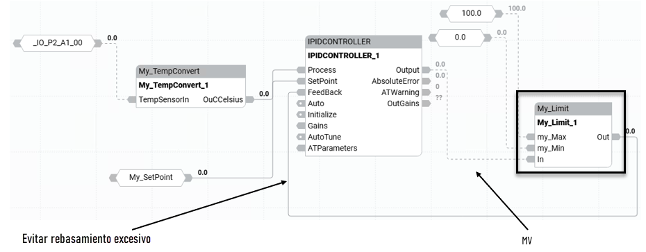 La adición de un bucle de retorno para el valor manipulado evita que se excedan los límites al proporcionar un valor mínimo y uno máximo para el MV.