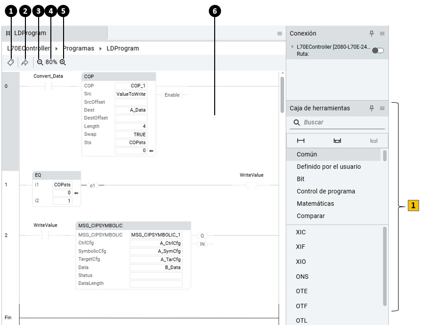 ![]() | Constituye la parte principal del editor LD. En esta área, se edita la lógica utilizando elementos de instrucción gráficos. |