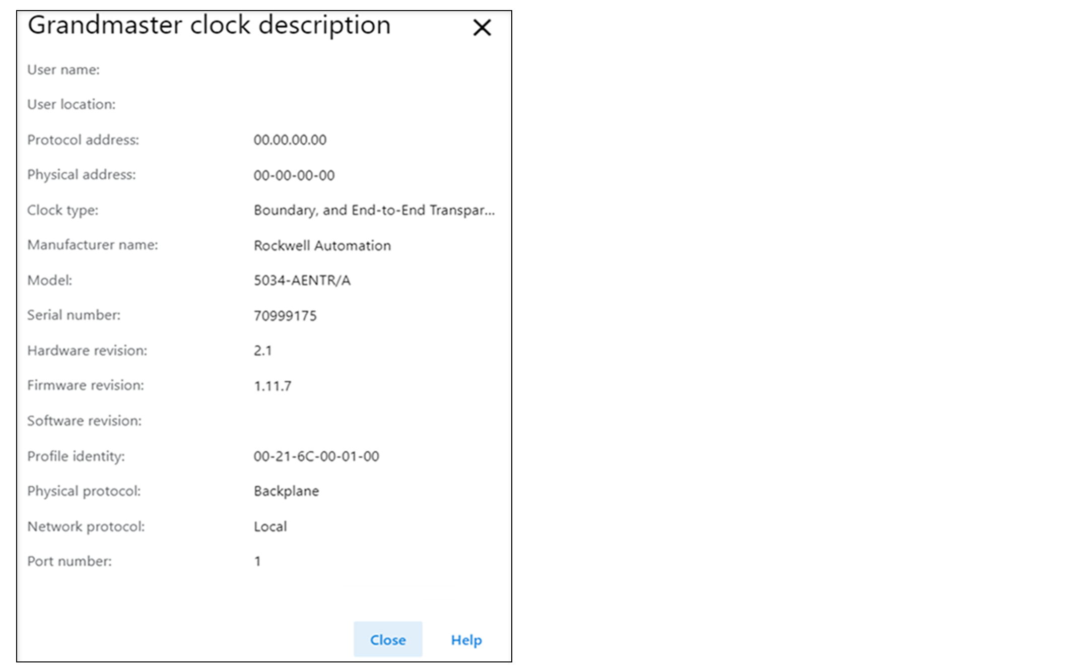 La boîte de dialogue Grandmaster Clock Description (Description de l’horloge maître) fournit des informations détaillées sur l’horloge maître. Pour afficher la description de l’horloge maître, sélectionnez Description dans la vue Time Sync (Synchronisation temporelle).