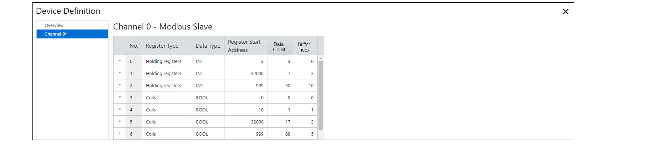 Si vous réglez Channel 0 (Voie 0) dans la vue Overview (Vue d’ensemble) sur Modbus Slave (Modbus esclave), vous pouvez afficher la vue Channel 0 – Modbus Slave (Voie 0 – Modbus esclave). Pour plus d'informations, voir Vue Channel 0 – Modbus Slave (Voie 0 – Modbus esclave).