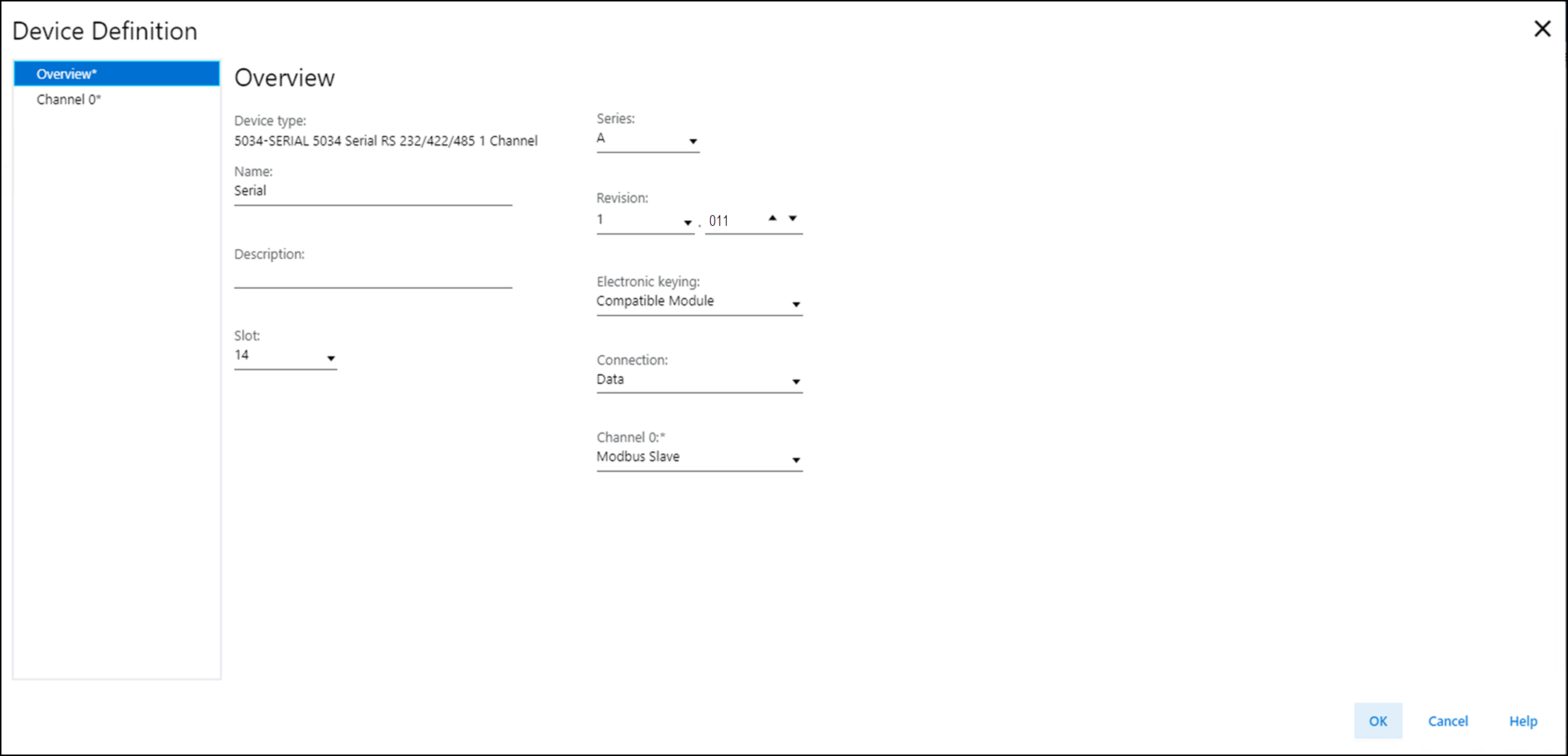 Lorsque vous ajoutez le module au projet pour la première fois, la boîte de dialogue Device Definition (Définition de dispositif) affiche uniquement la vue Overview (Vue d’ensemble) avec l’option Channel 0 (Voie 0) réglée sur Disabled (Désactivée) par défaut. Selon votre choix pour le paramètre Channel 0 (Voie 0), vous pouvez avoir des paramètres supplémentaires.