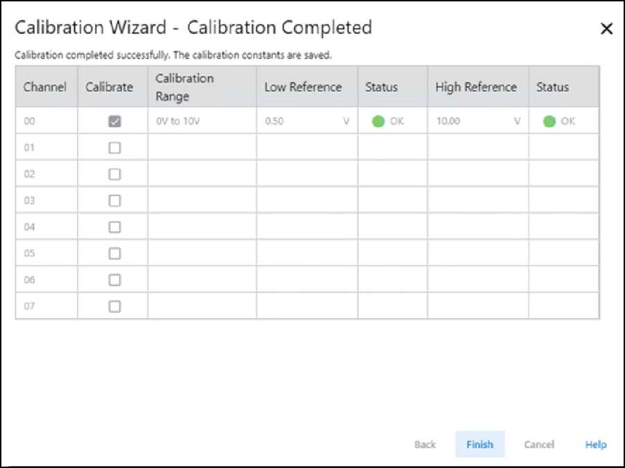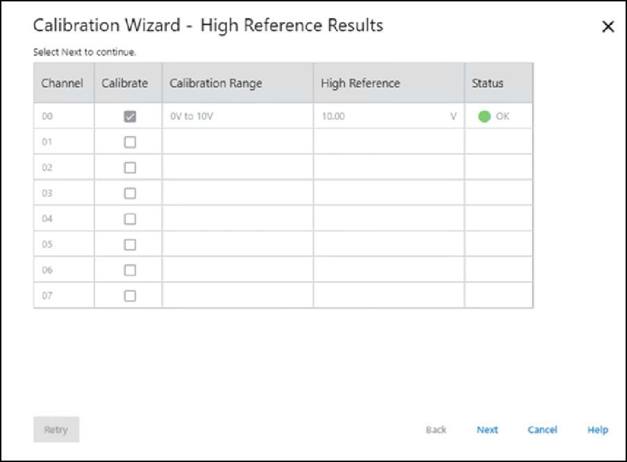 - Sélectionnez Next (Suivant). La boîte de dialogue High Reference Results (Résultats référence haute) apparaît et indique l’état de la voie calibrée.