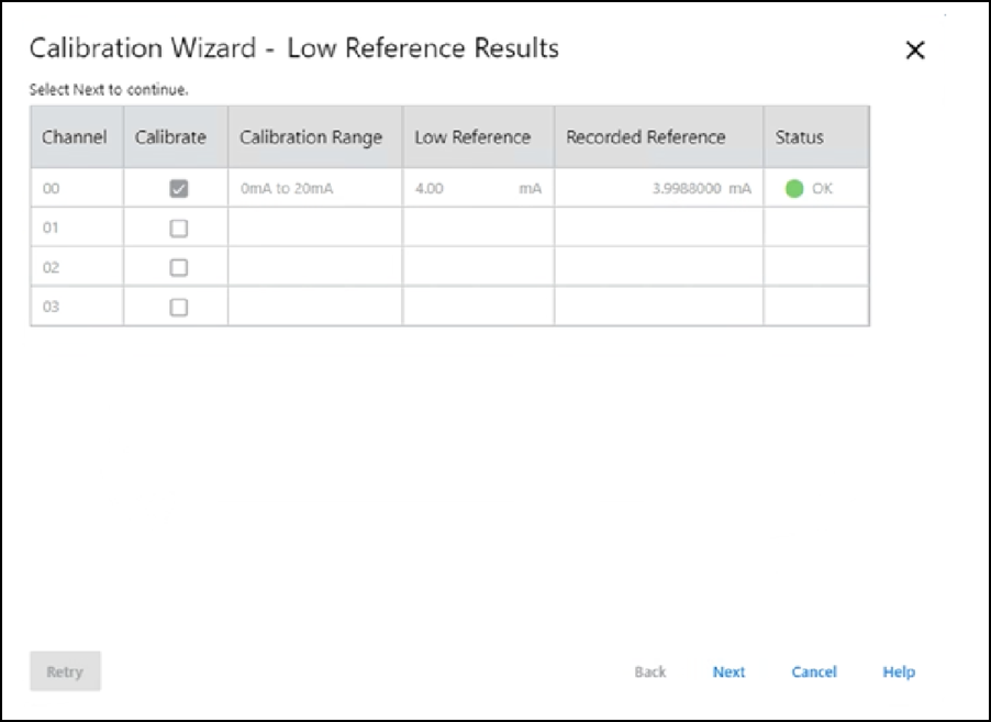 - Dans la colonne Recorded Reference (Référence enregistrée) enregistrez la valeur mesurée puis sélectionnez Next (Suivant).La boîte de dialogue Low Reference Results (Résultats référence basse) apparaît et indique l’état de la voie calibrée.
