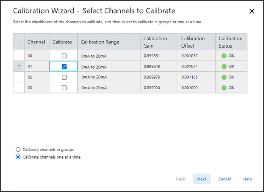- Sélectionnez les voies à étalonner une à la fois ou en groupes, puis sélectionnez Next.