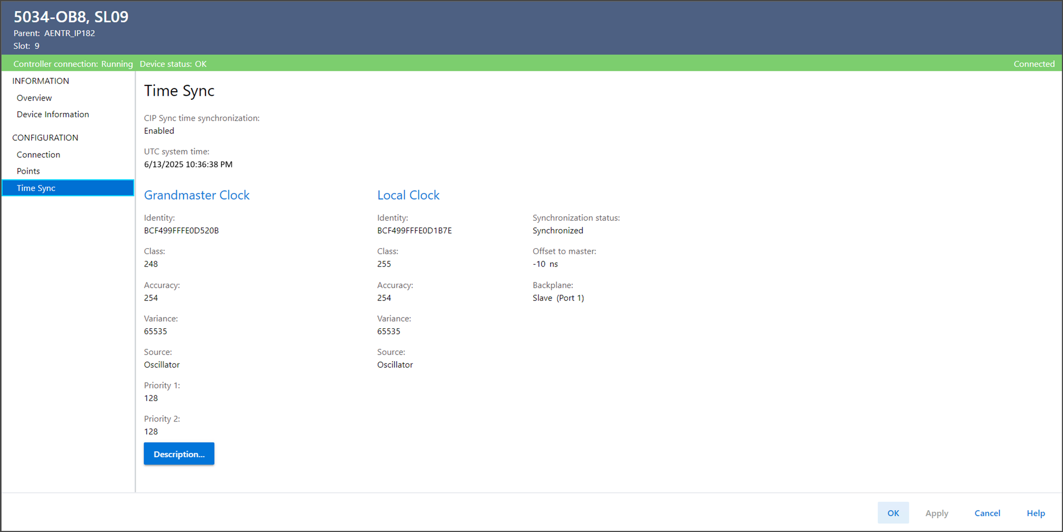 La vue Time Sync (Synchronisation temporelle) est en lecture seulement et affiche des informations sur l’état de CIP Sync à propos du module lorsque le projet est en ligne. La catégorie Time Sync affiche les informations suivantes :