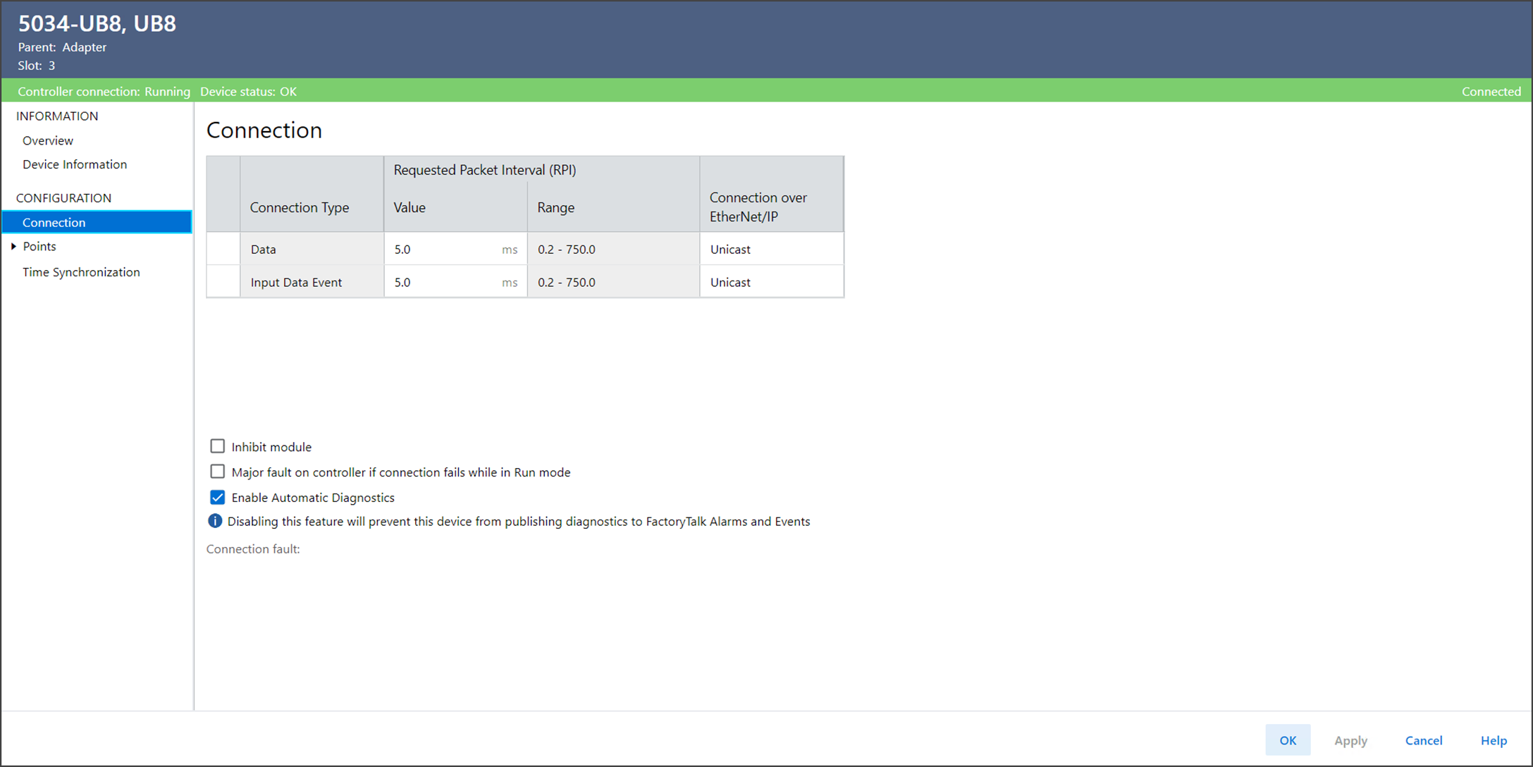 Si vous n’activez pas les diagnostics automatiques, le dispositif ne publie pas de diagnostics dans les alarmes et événements FactoryTalk.