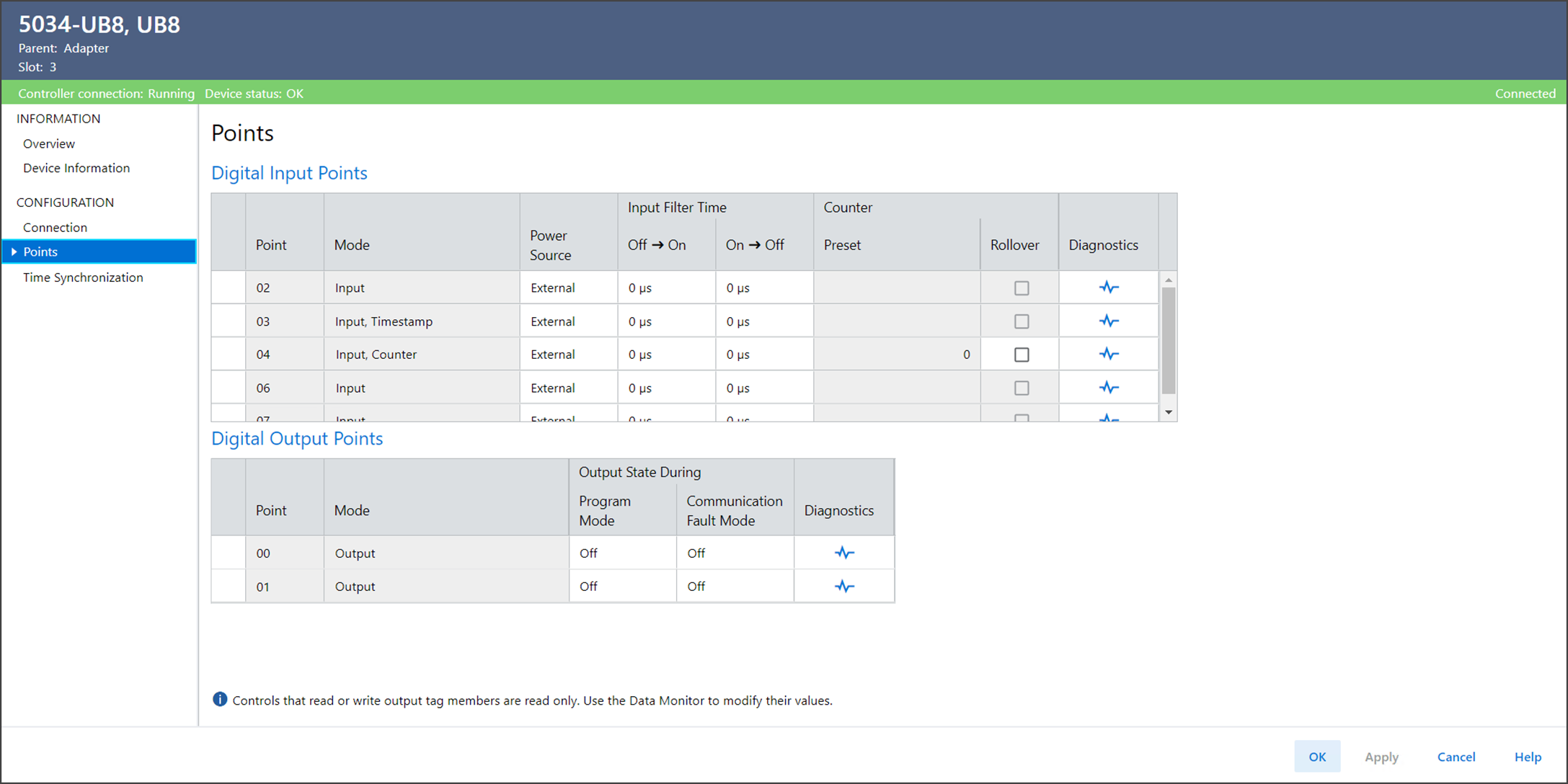 Pour afficher les diagnostics Ptxx, sélectionnez Diagnostics dans la vue Points ou Ptxx.