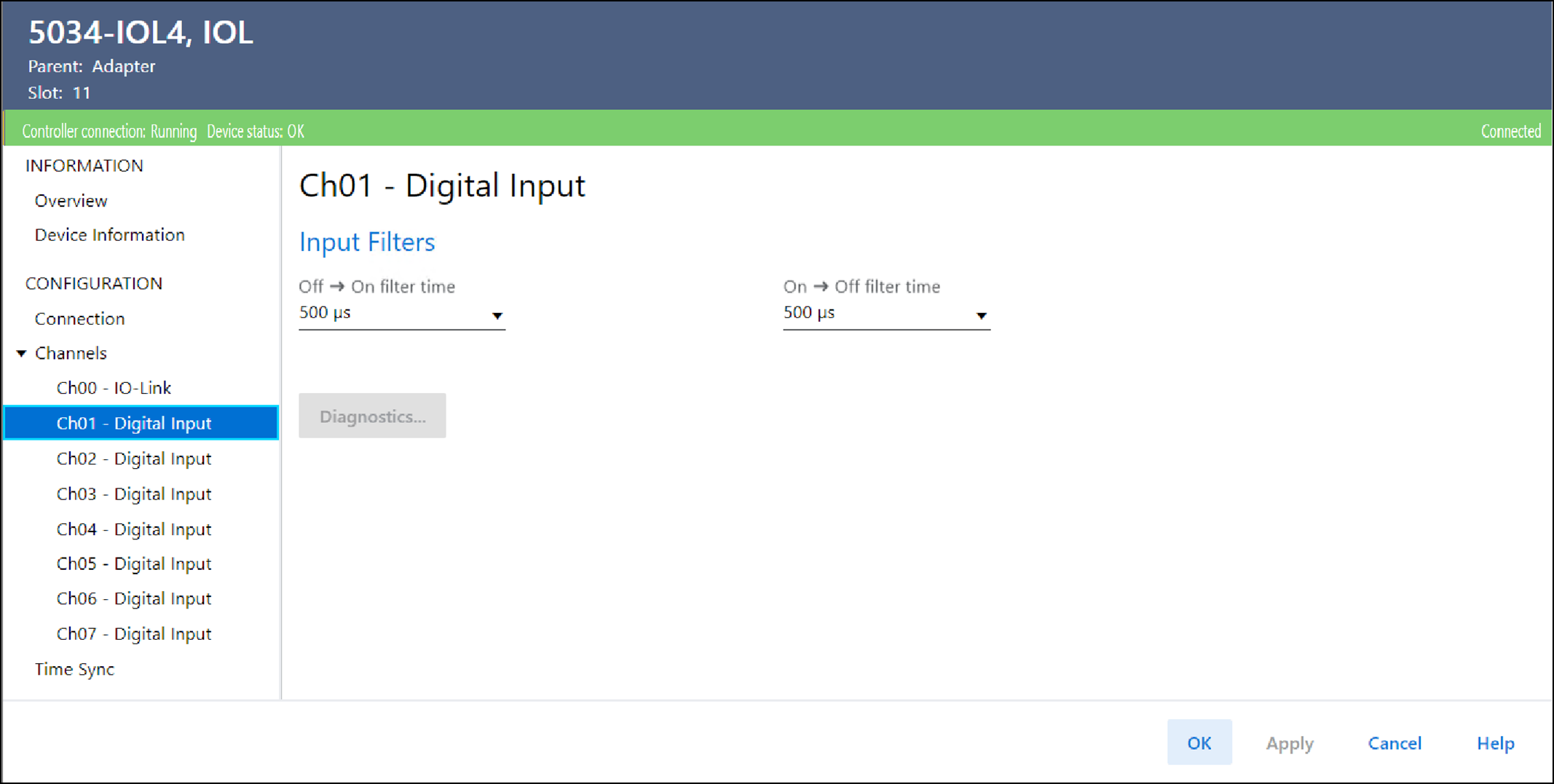 Cette vue est disponible lorsque la voie est configurée comme « Digital Input » (Entrée TOR). Vous pouvez exécuter certaines tâches uniquement lorsque le projet est en ligne.