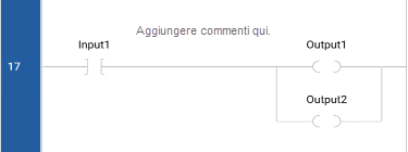 La variabile associata viene assegnata con lo stato booleano della connessione di sinistra. Lo stato della connessione di sinistra si propaga alla connessione di destra. La connessione di destra deve essere collegata alla barra di alimentazione verticale di destra (a meno che non siano presenti bobine parallele, caso in cui solo la bobina superiore deve essere collegata alla barra di alimentazione verticale di destra).
