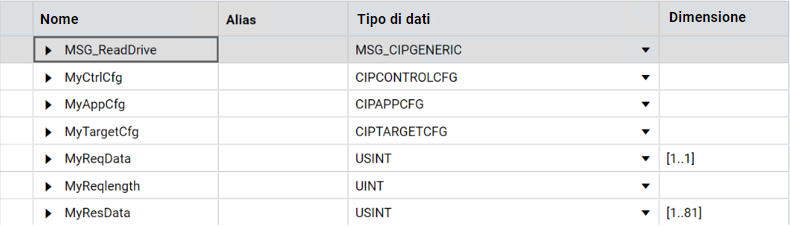 - Nella griglia delle variabili locali, aggiungere le variabili secondo la seguente tabella.Tipi di variabili e dati nella pagina VariabiliParametroNome variabileTipo di datiMSG_CIPGENERICMSG_ReadDriveMSG_CIPGENERICCtrlCfgMyCtrlCfgCIPCONTROLCFGAppCfgMyAppCfgCIPAPPCFGTargetCfgMyTargetCfgCIPTARGETCFGReqDataMyReqDataUSINTReqLengthMyReqLengthUINTResDataMyResDataUSINT (array)