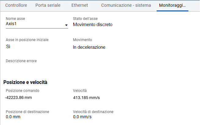 - Lo stato dell'asse passa in movimento discreto, fino a quando raggiunge la velocità zero. Quando la velocità raggiunge lo zero, Done viene impostato su True e lo stato dell'asse cambia a Fermo.