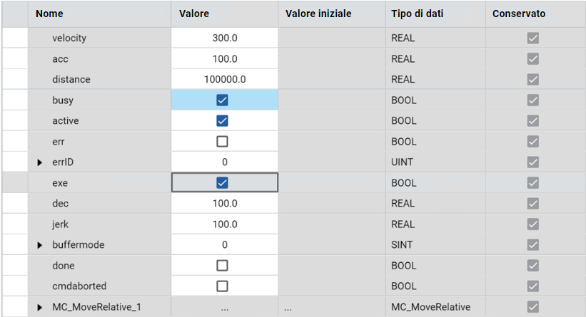 L'istruzione MC_MoveRelative comanda un movimento controllato di una distanza specificata relativa all'effettiva posizione al momento dell'esecuzione.