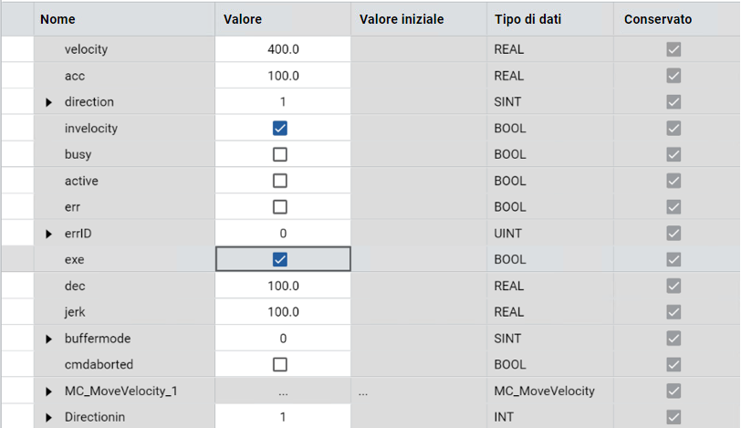L'istruzione MC_MoveVelocity determina un movimento controllato infinito a una velocità specificata.