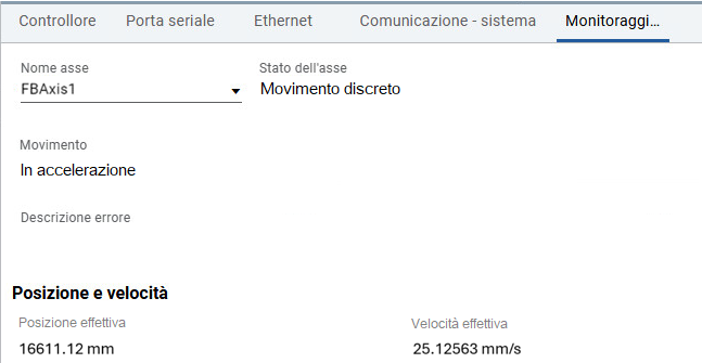 ActualVelocity | Uscita | REAL | Il valore della velocità effettiva per l'asse Motion feedback (in unità dell'asse [u/s]). ActualVelocity è un valore con segno, che include le informazioni di direzione. |