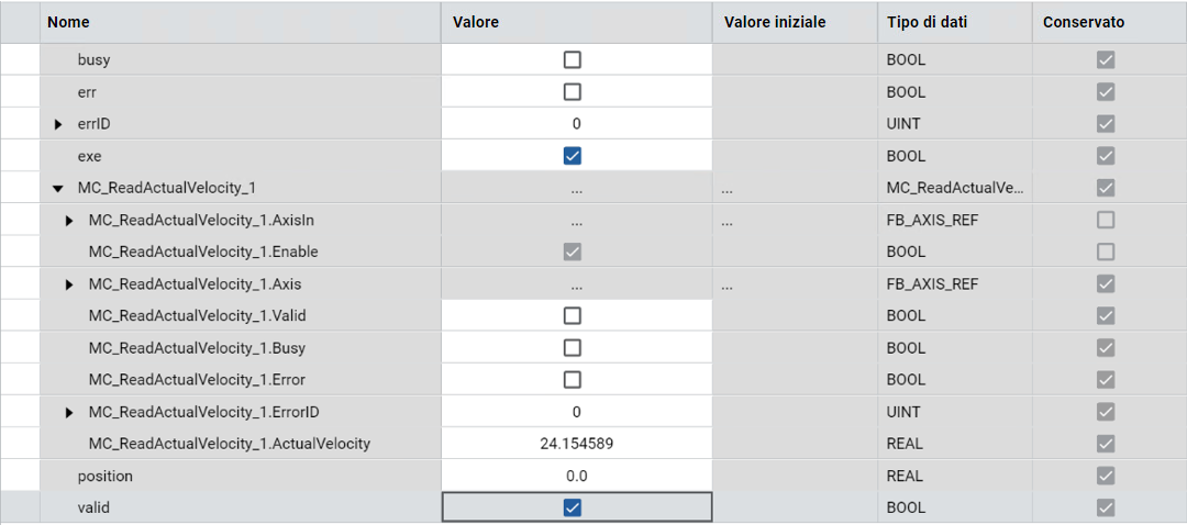 MC_ReadActualVelocity (velocità effettiva di lettura del controllo movimento)