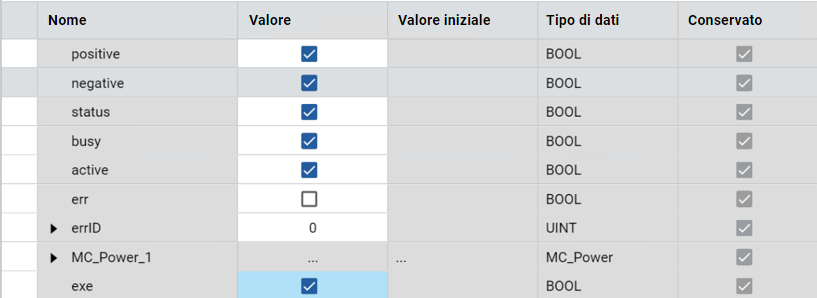 - Il blocco funzione MC_Power può accendersi sull'asse se Enable è impostato su True e spegnere l'asse se Enable è impostato su False.