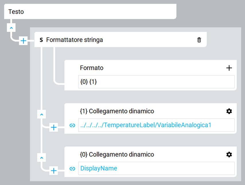 - Creare un collegamento dinamico avanzato traTestoeVariabileAnalogica1con l'uso di un formattatore stringa: