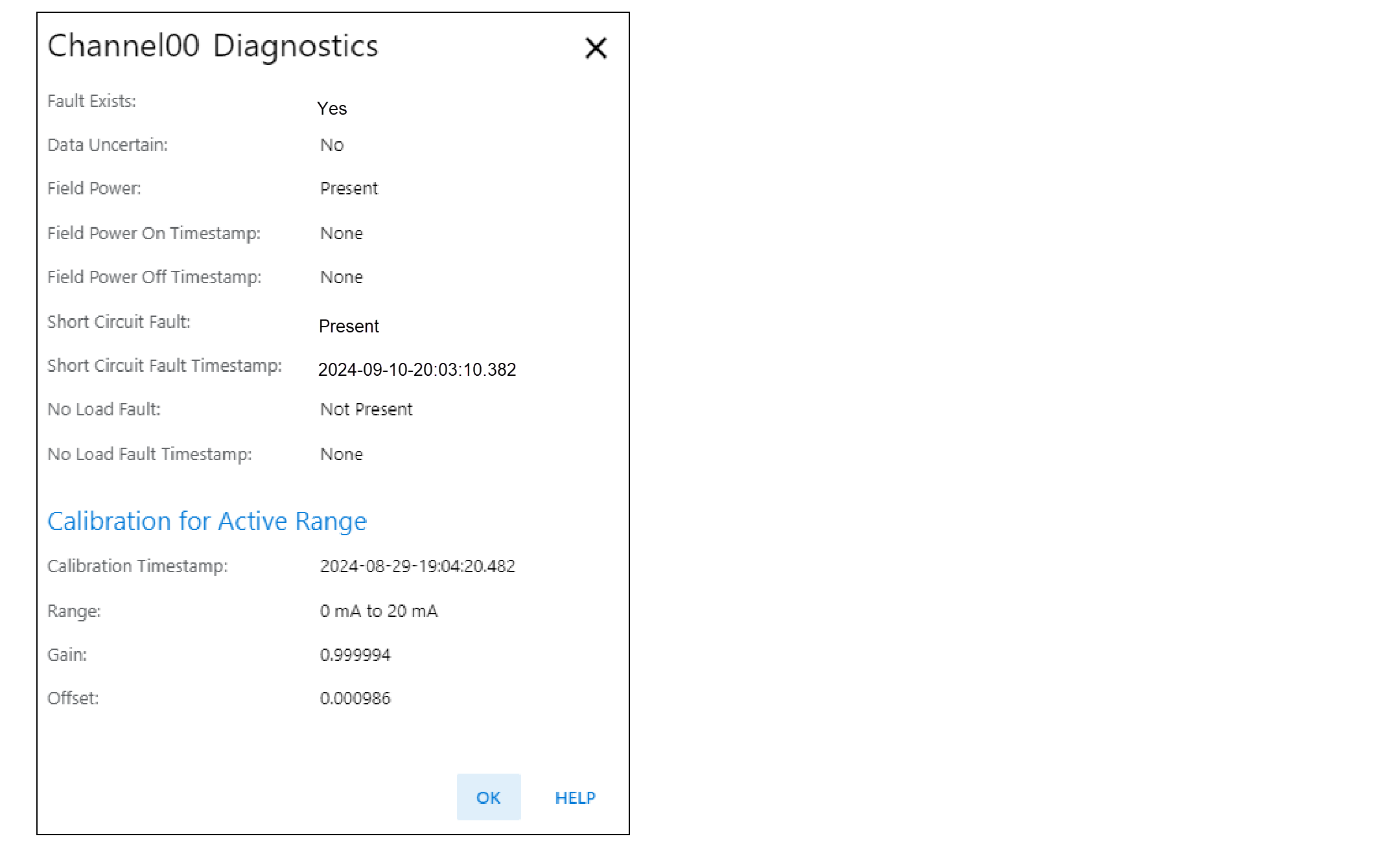 Esempio di finestra di dialogo Channel Diagnostics con errore di cortocircuito