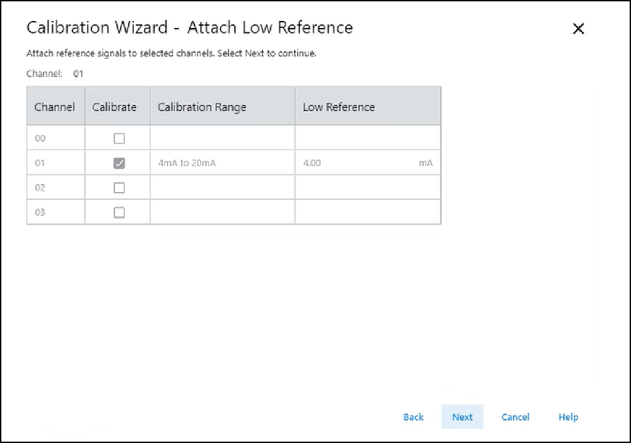 - Quando viene visualizzata la finestra di dialogo Attach Low Reference, impostare il calibratore sul riferimento basso e applicarlo al canale.