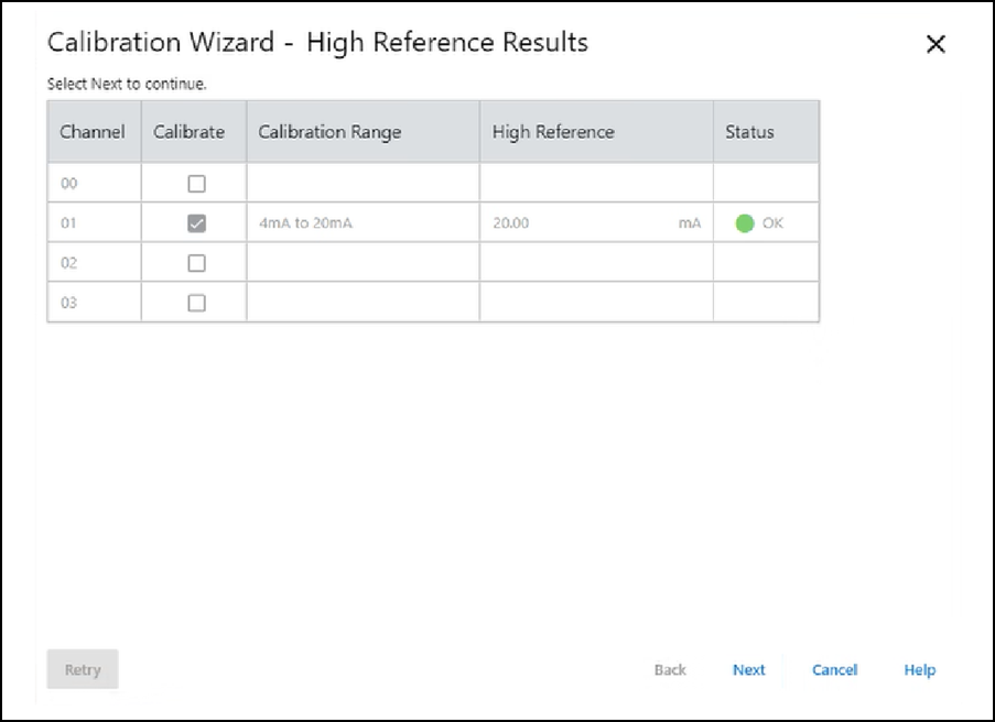 - Selezionare Next. Viene visualizzata la finestra di dialogo High Reference Results, che indica lo stato del canale calibrato.