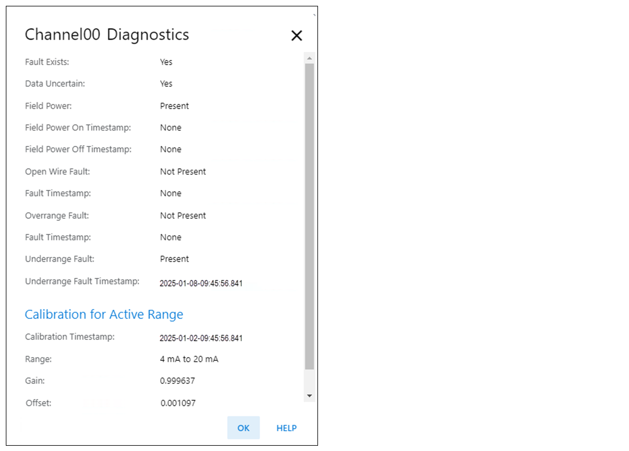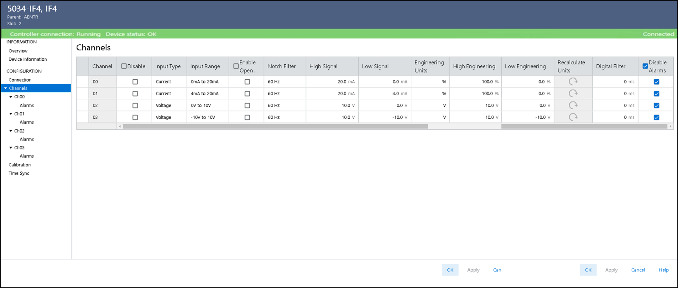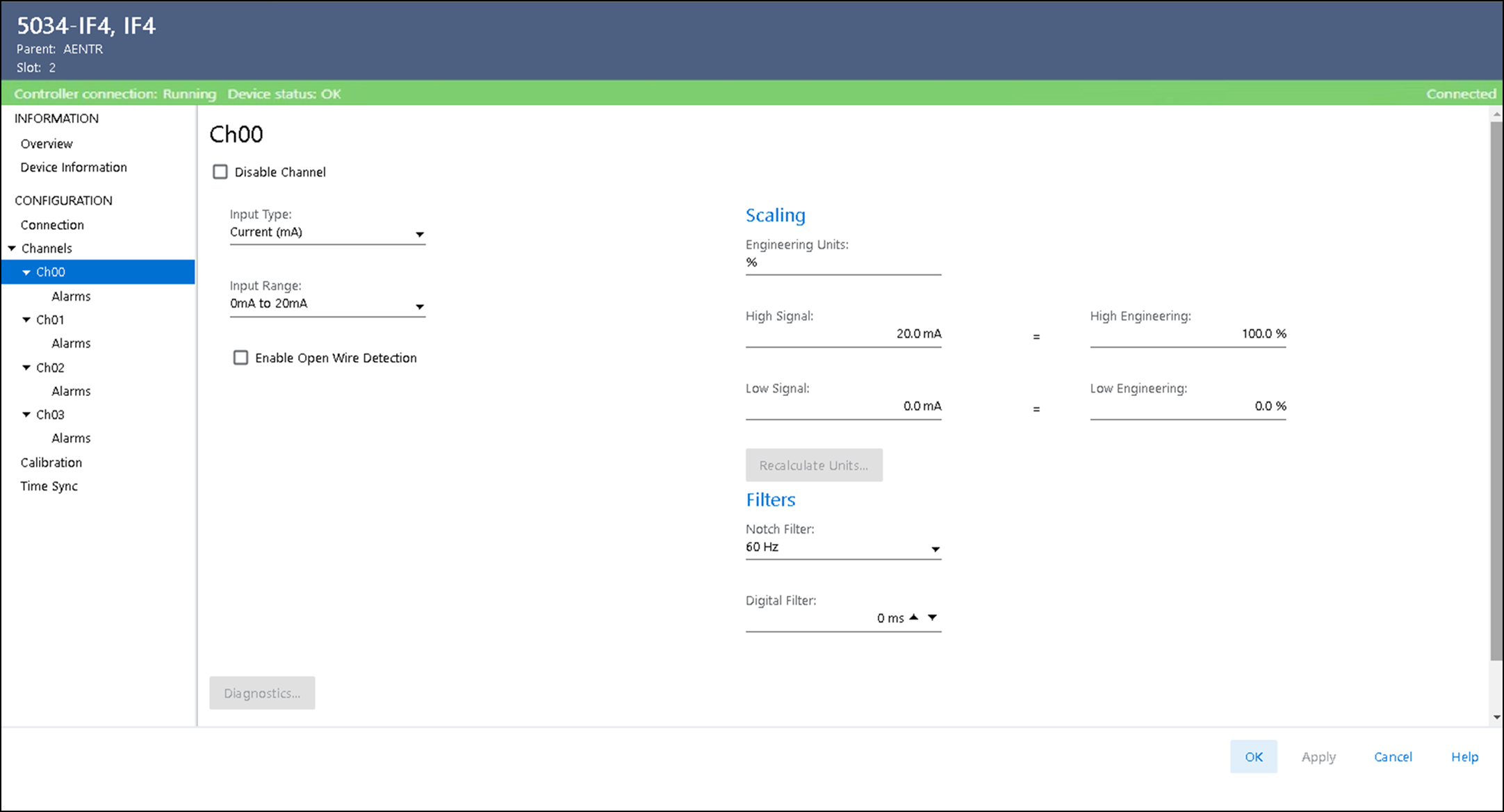 Visualizza le informazioni diagnostiche dei canali quando si è collegati al modulo. Quando si è online con il modulo, fare clic sul pulsante Diagnostics nella pagina Chxx per visualizzare le informazioni diagnostiche.