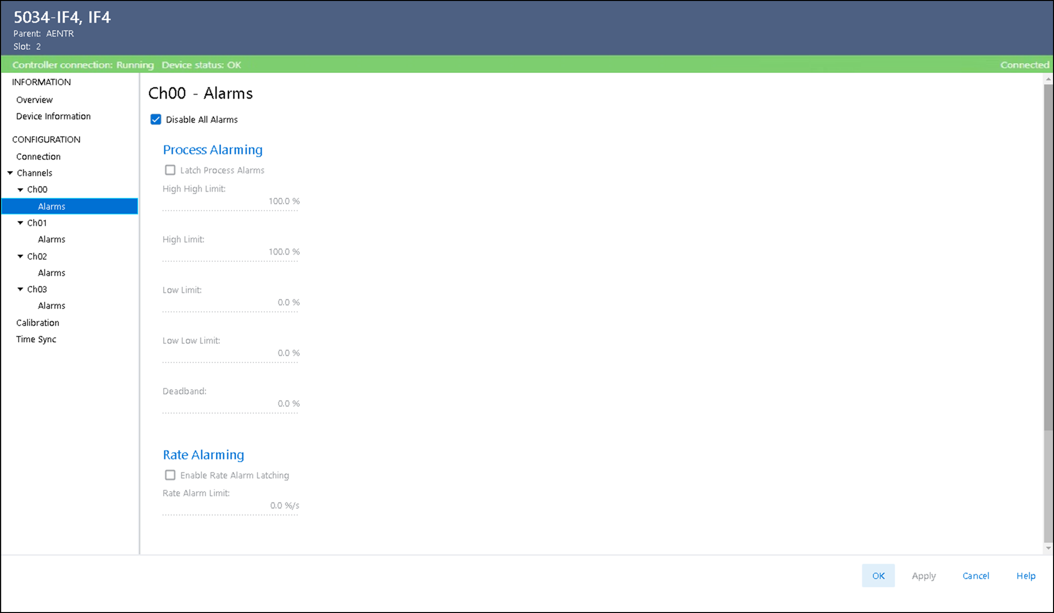 - Abilitare/disabilitare il mantenimento e impostare i limiti di allarme per gli allarmi di processo: