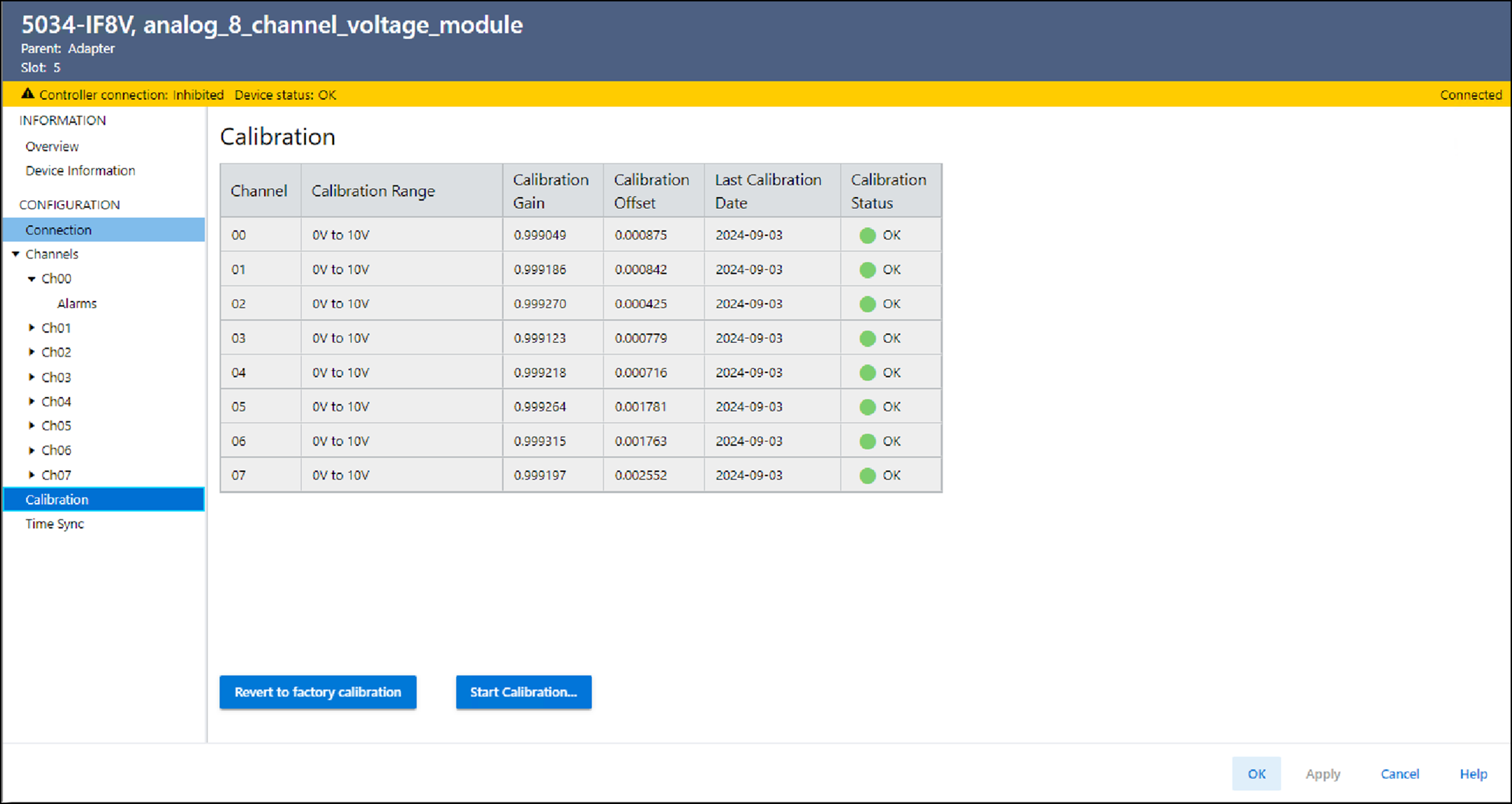 La pagina Calibration contiene informazioni sulla calibrazione di tutti i canali del modulo. Per tutti i canali, in questa pagina è possibile eseguire le azioni seguenti: