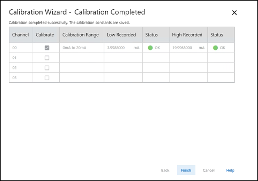 - Nella colonna Recorded Reference, registrare il valore misurato e fare clic su Next.Viene visualizzata la finestra di dialogo High Reference Results, che indica lo stato del canale calibrato.