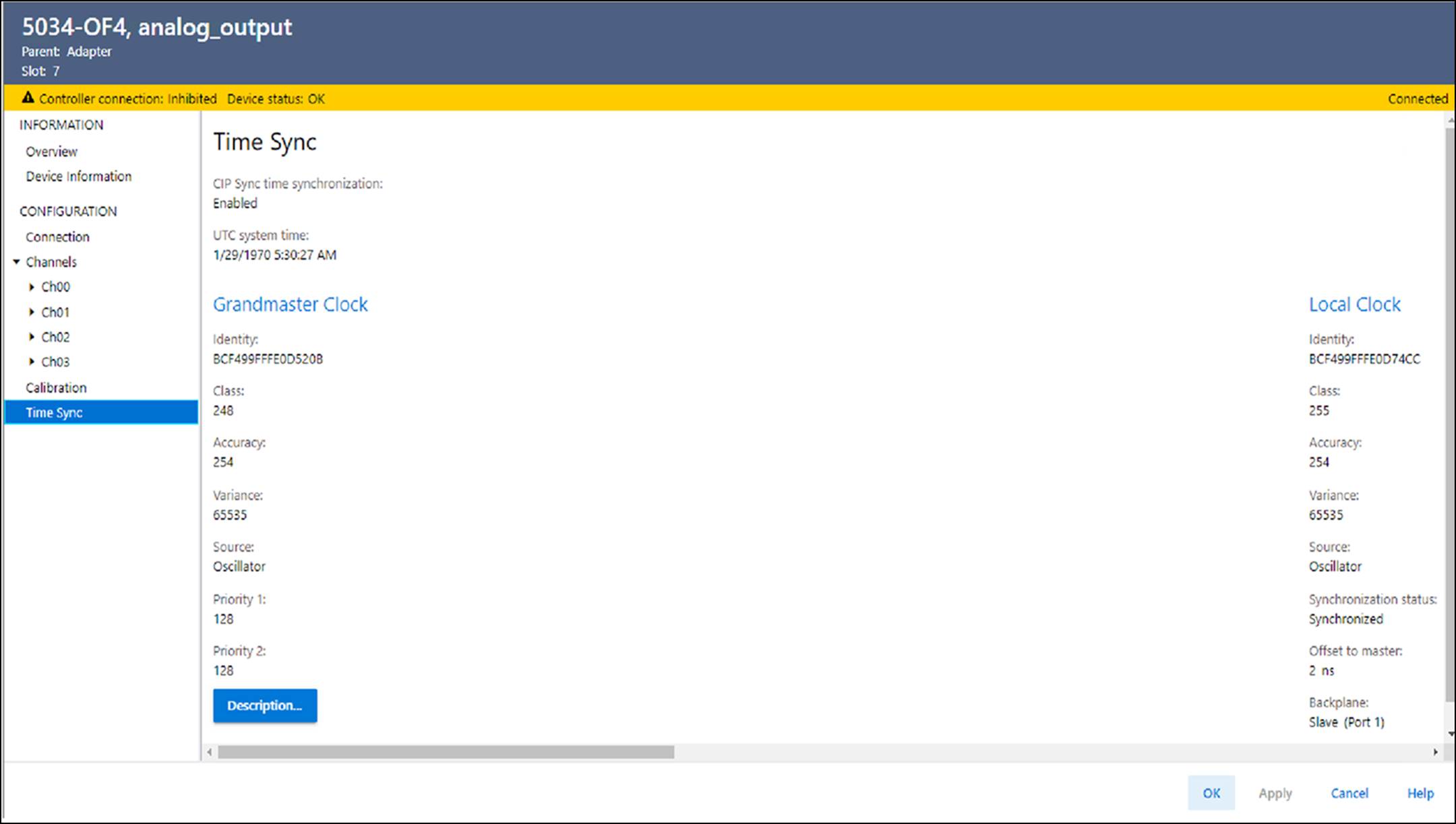 La finestra di dialogo di descrizione dell’orologio Grandmaster fornisce informazioni dettagliate sull’orologio Grandmaster. Per visualizzare la descrizione dell’orologio Grandmaster, selezionare Description nella pagina Time Sync.