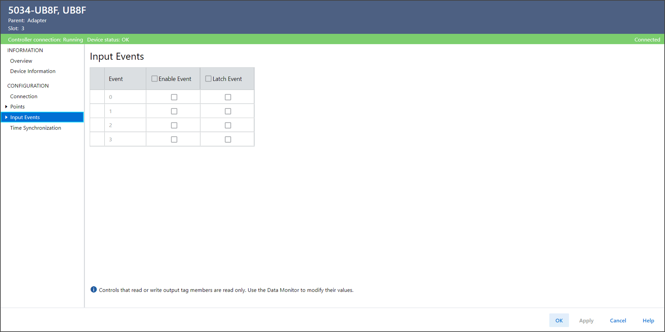 La pagina Input Events mostra una panoramica dei valori di configurazione di tutti gli eventi in ingresso. È possibile eseguire determinate operazioni solo quando il progetto è online.