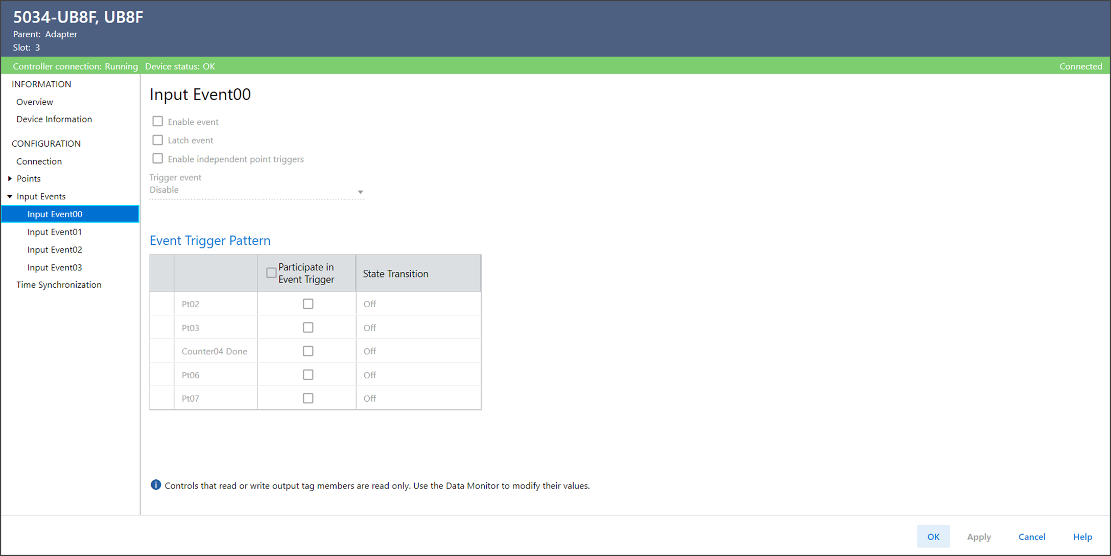 La pagina Input Eventxx, dove ‘xx’ rappresenta l’indice di una definizione di evento, mostra le opzioni di configurazione disponibili per quell’evento. Non è possibile configurare i parametri da questa pagina, è necessario utilizzare i tag di configurazione.