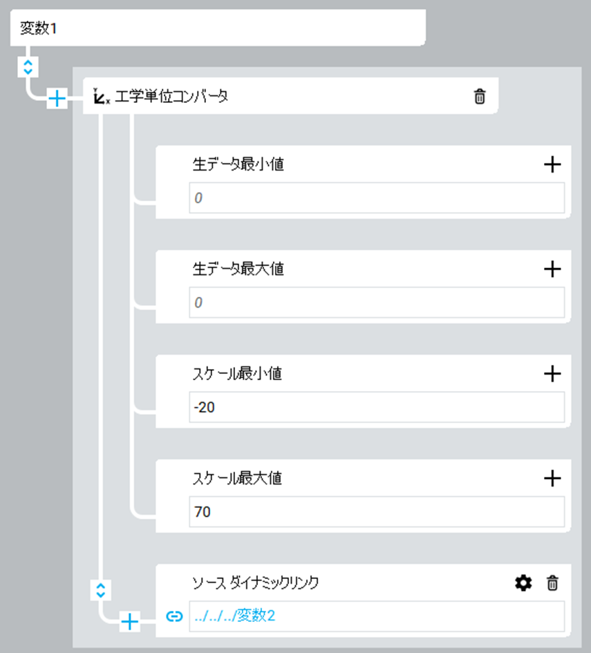 [生データ最小値] プロパティと [生データ最大値] プロパティは設定されていません。 | コンバータは、ダイナミックリンクを介して入力にアナログ変数が設定されていることを前提としています。 [生データ最小値] と [生データ最大値] は、入力アナログ変数の [下限] と [上限] にそれぞれ設定されます。 |