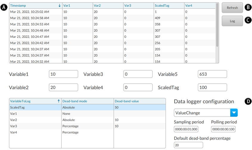 D | データロガー構成セクション | モニター対象変数とデータロガーの構成パラメーターを変更できます。クラウドにデータを送信するには、ブローカーに関連するすべてのパラメーターを構成する必要があります。 |