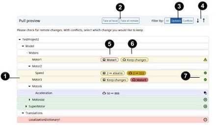 ![]() | [すべて] のプロジェクトコンテンツ、プロジェクトへの [更新] のみ、またはプロジェクト内の [競合] のみを表示することにより、プレビューの変更をフィルター処理します。 |