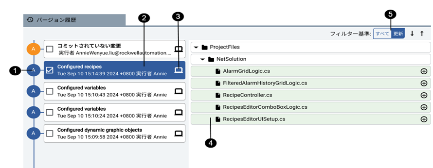 変更の説明、コミットの日時を含むコミット。 を選択してコミットを選択し、コミット内の変更を表示します。