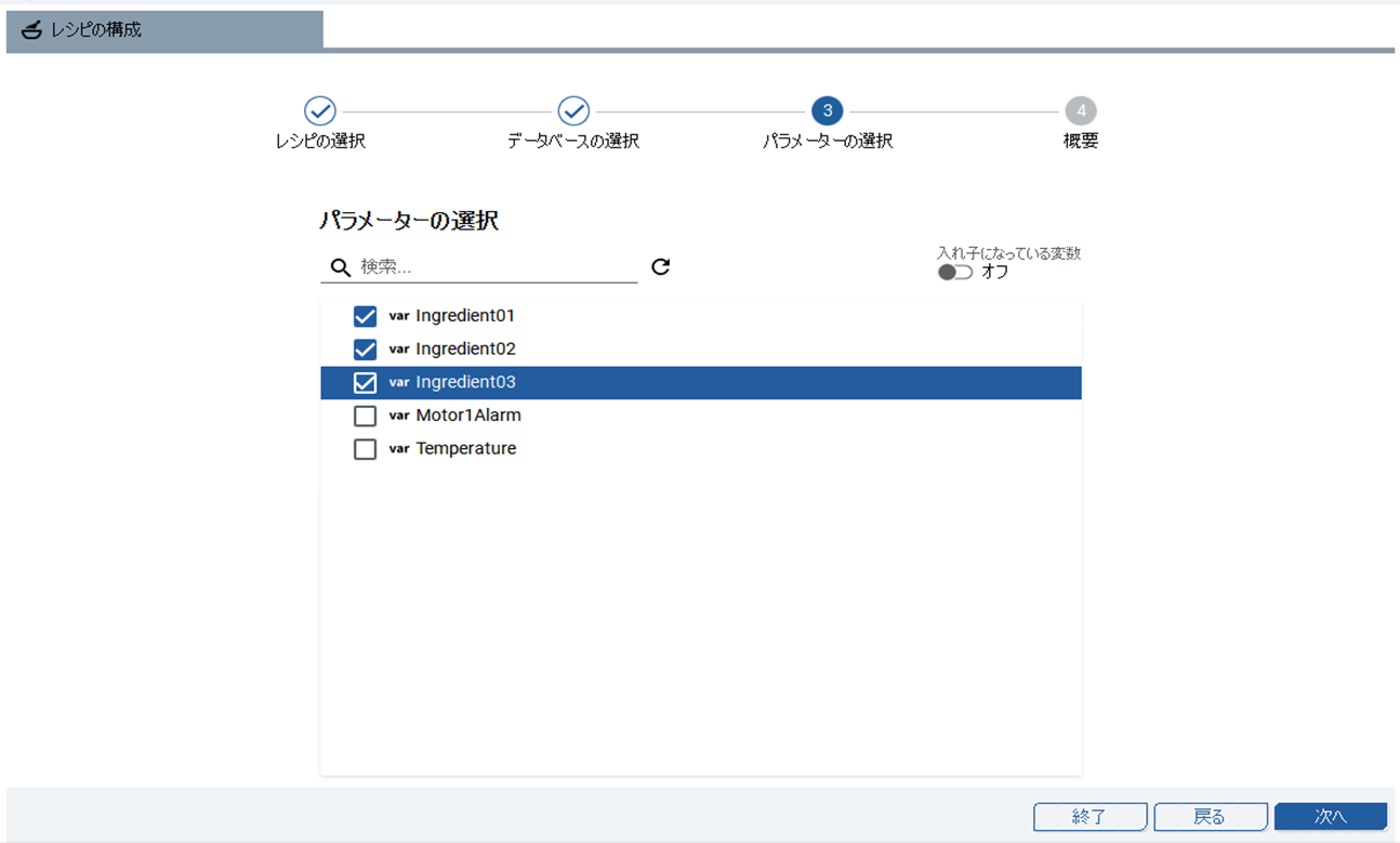 - [Ingredient01]、[Ingredient02],および[Ingredient03]を選択し、[次へ]を選択します。変数の選択