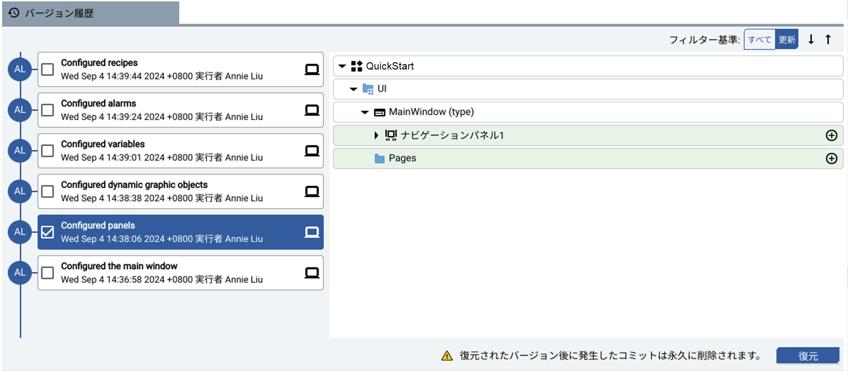 コミット履歴を表示し、プロジェクトをコミットに復元するには、