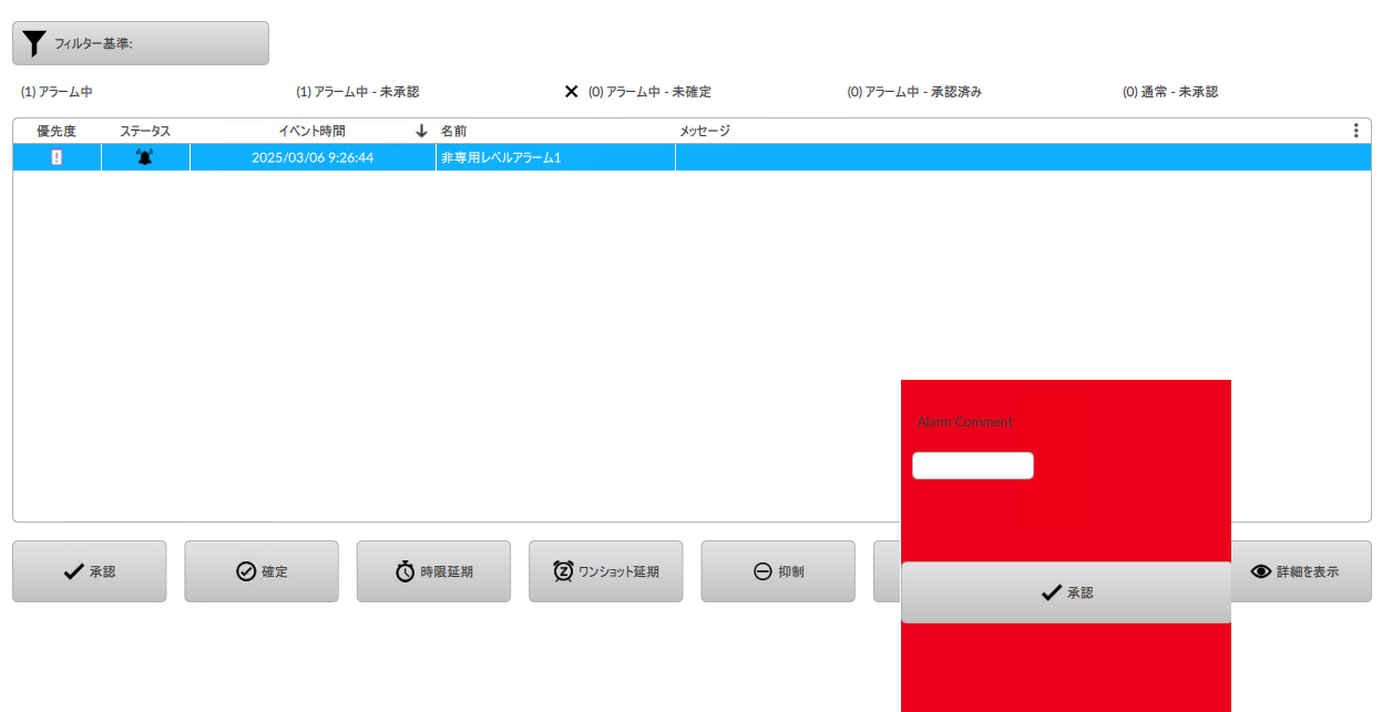 [アラーム概要] でアラームを承認するときにコメントを入力できるコメントダイアログボックスを作成します。